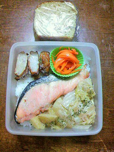 おかず:鮭の塩焼き。白菜とじゃがいもの味噌炒め。人参のナムル。いかのあげもの。