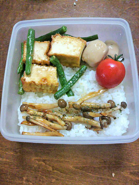おかず:厚揚げといんげんの煮付け。里芋の煮っ転がし。プチトマト。きのこのオイスター炒め。