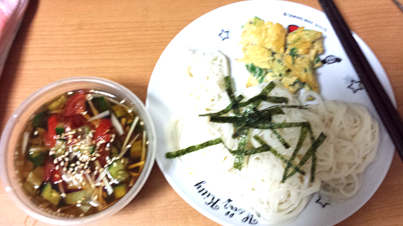 そうめんのつけ汁は、キュウリ細かく刻んで、生姜を細切りにして、トマト刻んで、めんつゆ濃い目。