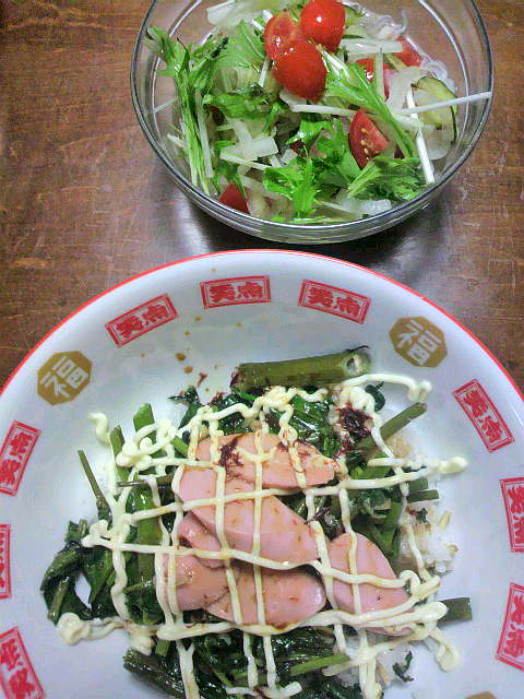 ありもので。空芯菜のニンニク炒めをご飯に乗っけて、ちょっと炒めた魚肉ソーセージ乗っけて、マヨ乗っけて醤油をぱらっと。丼飯は最強に楽です。