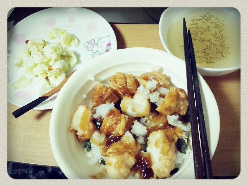 半額のお惣菜でから揚げゲットしてくるじゃろ?白米の上に醤油みりん酒砂糖片栗粉チンして作ったタレかけるじゃろ? ちぎった海苔しいてあっためたから揚げ乗せるじゃろ?その上からまたタレかけるじゃろ?大根おろし乗せるじゃろ?食うじゃろ?うめえ。