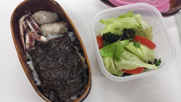 おかず:イカのバジル炒め。れんこん餅。サラダ(レタス、トマト、ブラックオリーブ、かいわれ大根)