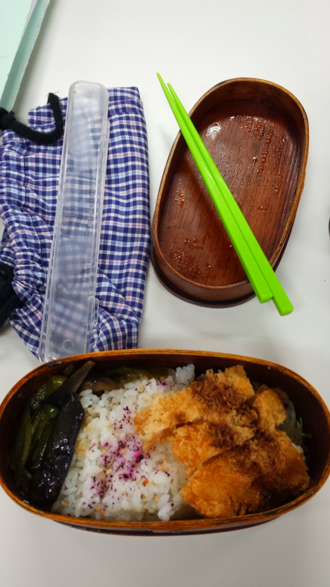 おかず:カツ、なすとピーマンの油炒め