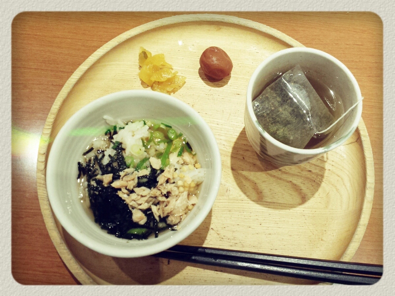 茶出汁があったのでお茶漬けです。のりと葱とアラレとほぐし鮭。