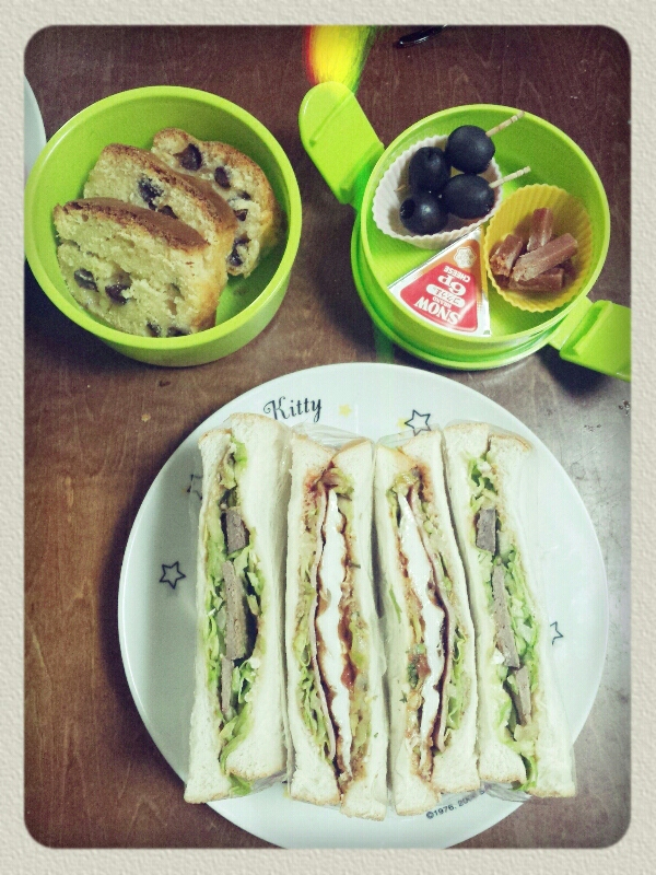 サンドイッチとパウンドケーキだけでもよかったんだけど冷蔵庫にあるもの詰めてったらなんかこんなことに。いいよねパンはごはんに比べて消化早いし、盛り沢山で。