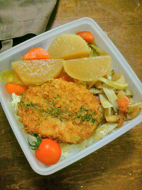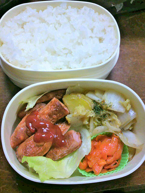 おかず:白菜とじゃがいもの味噌炒め。焼いた魚肉ソーセージ。人参のグラッセ。